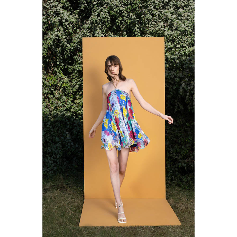 MANDIRA WIRK Hibiscus Printed Halter Neck Short Dress with Chain Detailing