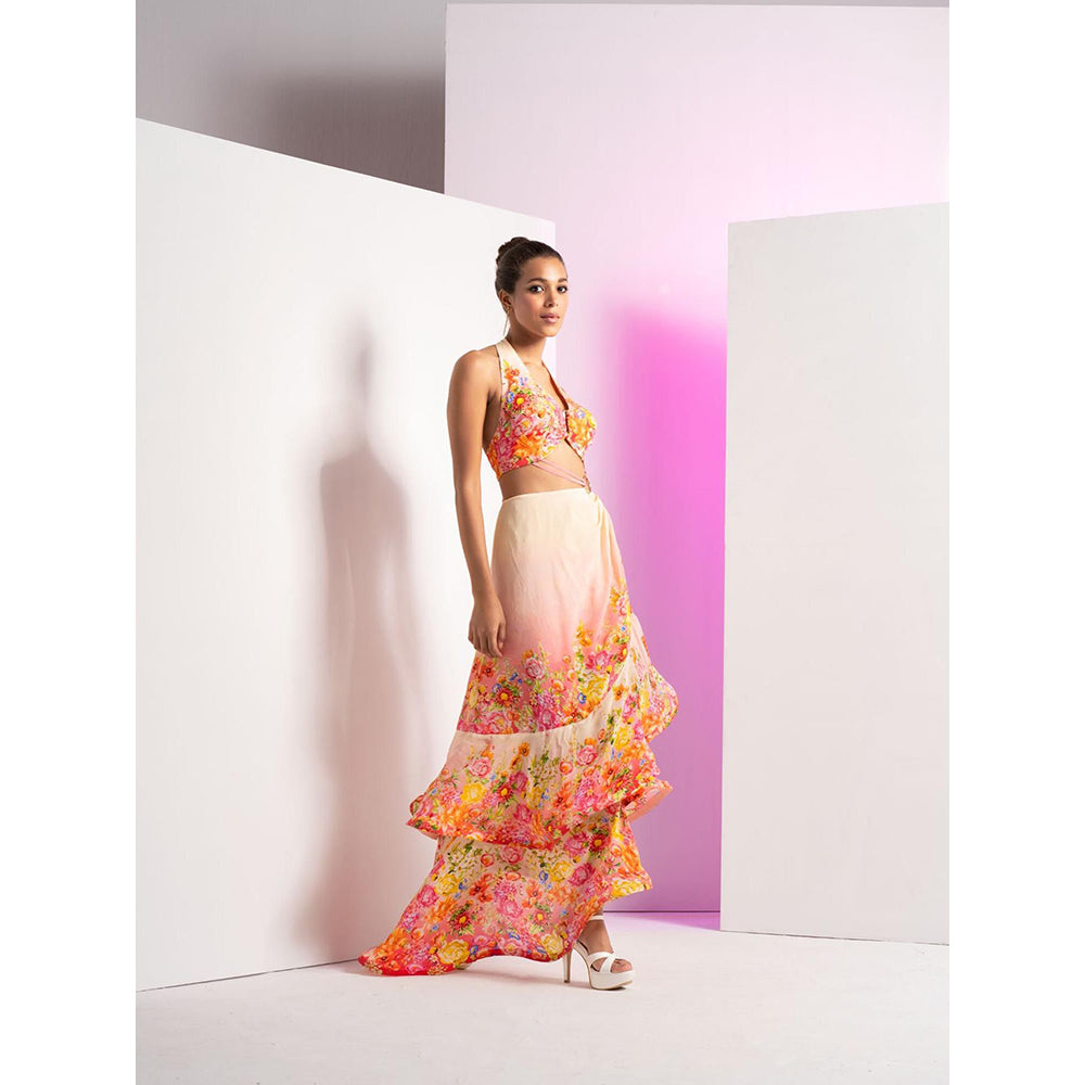 MANDIRA WIRK Ivory Dainty Floret Asymmetric Dress with Back Tie Up