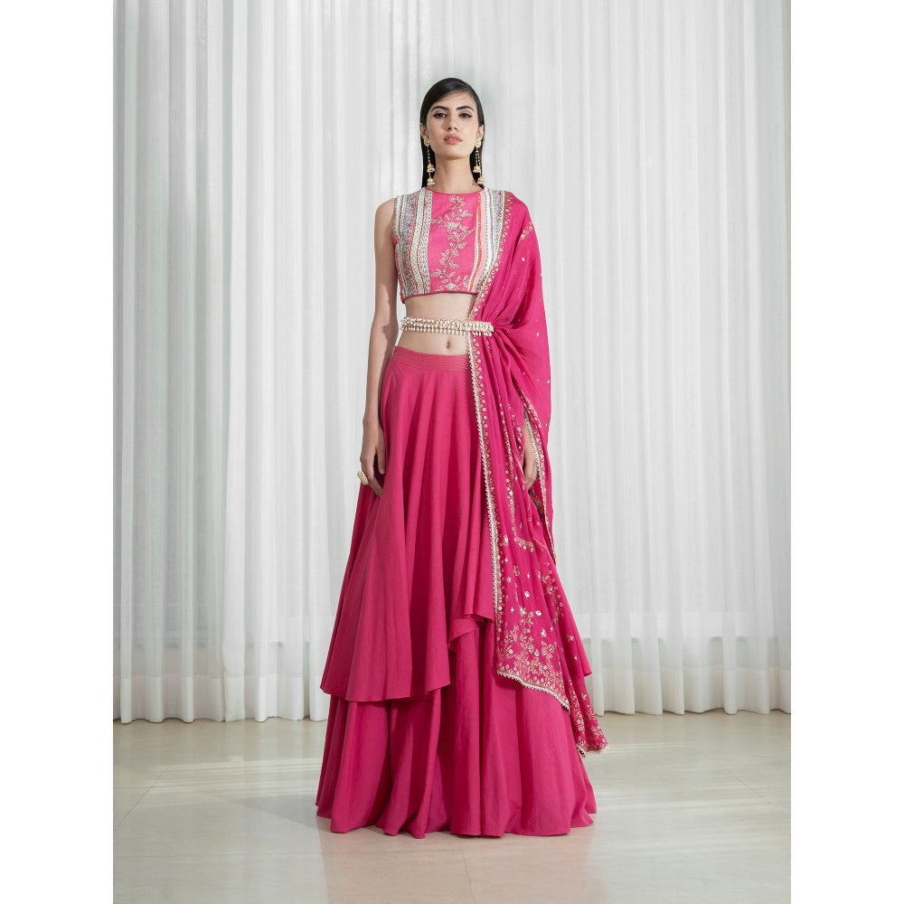 Description : Fusia double layered skirt with zari textured belt paired with patchwork blouse mix of print, solid and texture, zari and gota work. and foil printed chiffon dupatta with mirror work. neckline : closed neck , side zip and shoulder open.