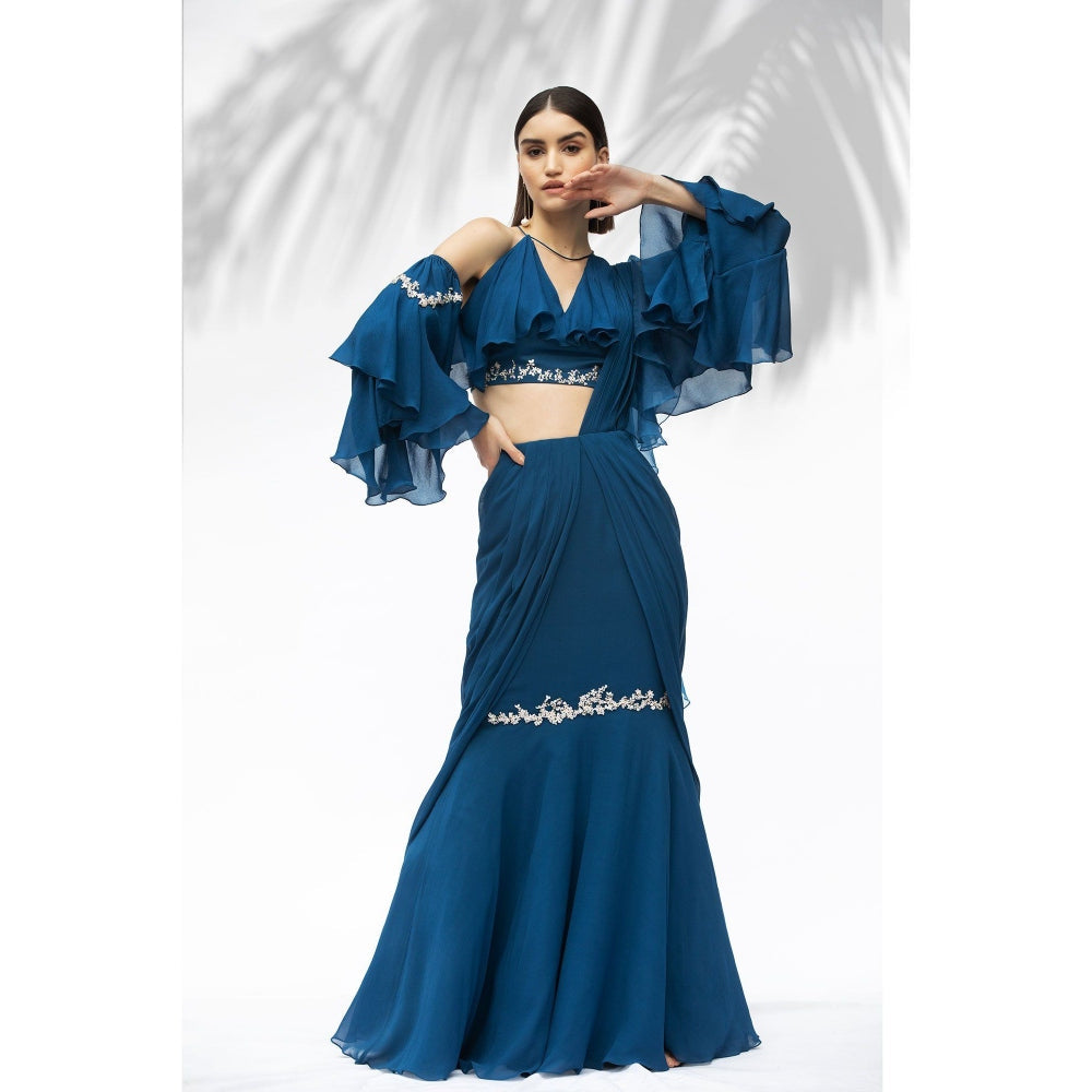 Description : Walk in style by wearing this cocktail saree from Mandira Wirk. Tailored to sartorial perfection from premium quality fabric, it assures a soft and soothing touch against the skin. This set features a chiffon sapphire blue embroidered butterfly sleeves blouse with georgette embroidered draped saree with organza attached palla. Team this saree with a pair of heels for a chic look.