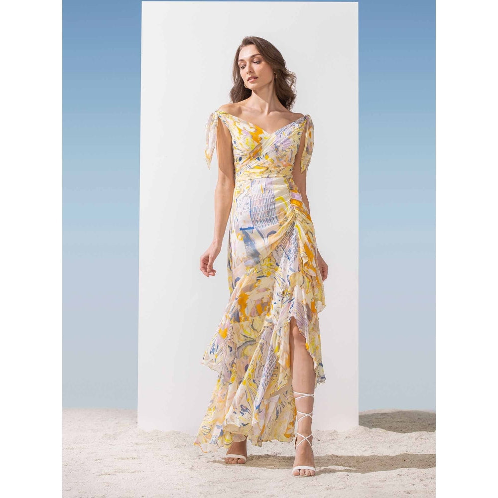Description : Chiffon printed cold shoulder dress with shoulder tie-up and layered bottom with ruched detail