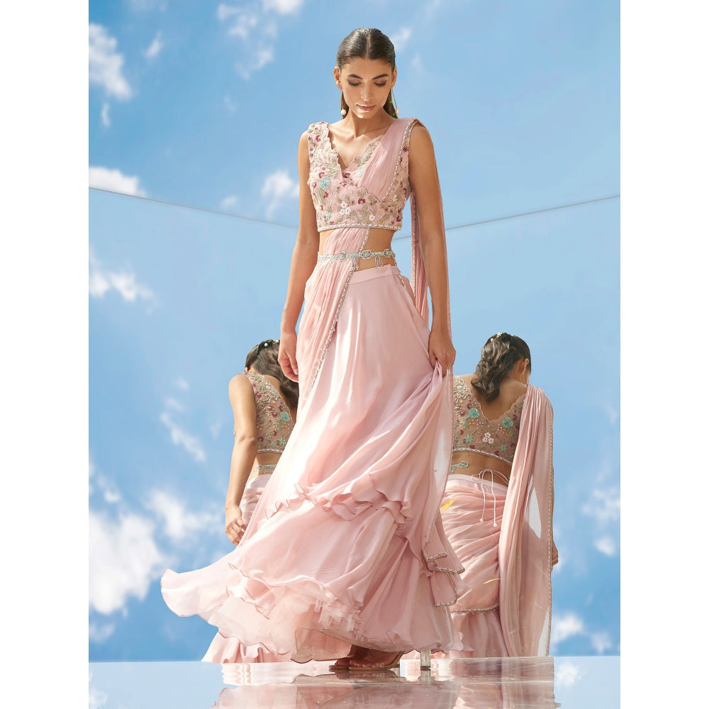 Mandira Wirk Pink Eden Embroidered Tier Drape Saree Stitched Blouse With Dupatta (Set of 3)