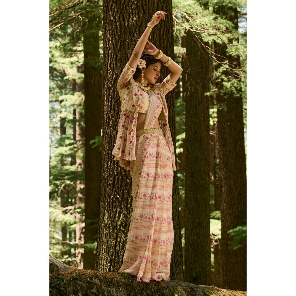 Paulmi & Harsh Off White Rose Border Print Pre Draped Saree with Stitched Blouse