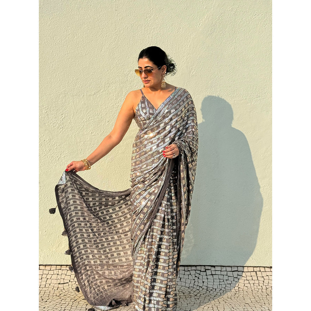 Silver Georgette & Sequin Embroidered Sari & Spaghetti Stitched Blouse