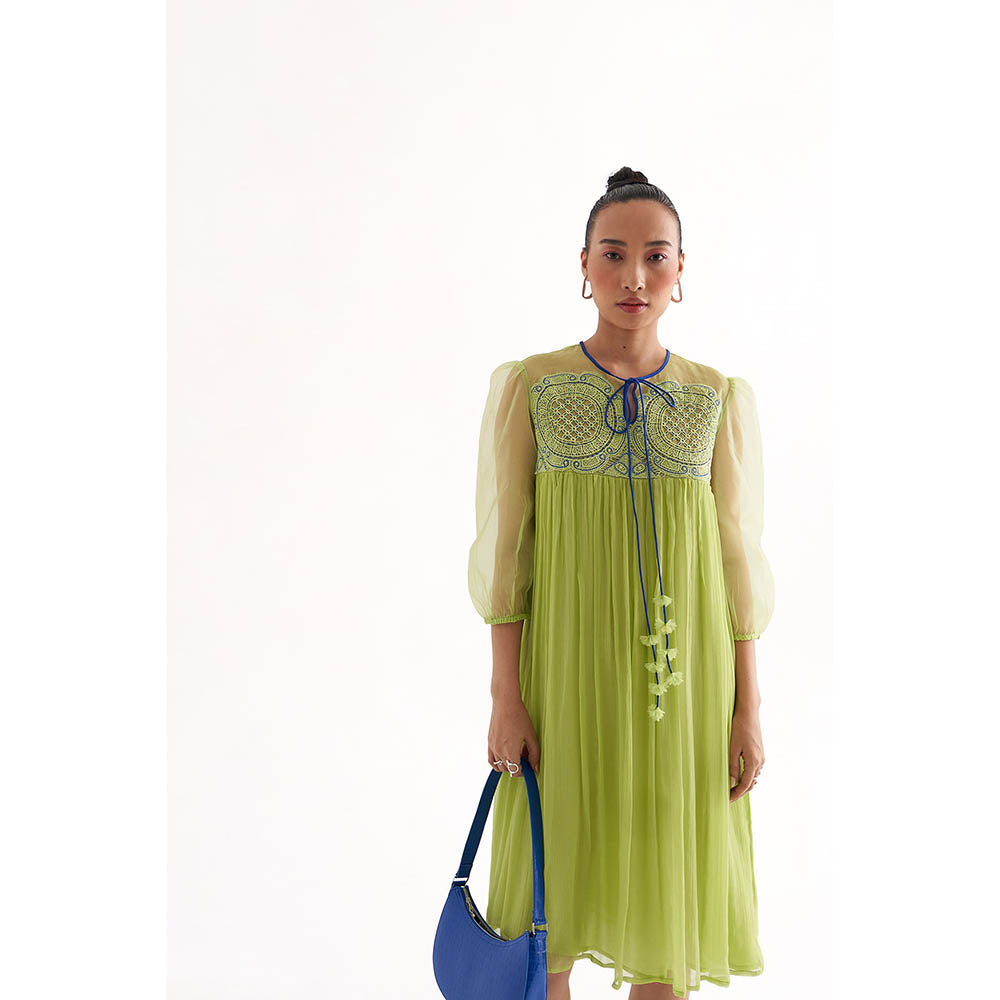 Description : Experience the elegant way of dressing with this green dress by Our Love. Crafted from high quality chiffon, it features pull on closure and embroidered pattern along with three fourth sleeves & tie up neck. Pair it with shoes and watch to complete your ensemble.