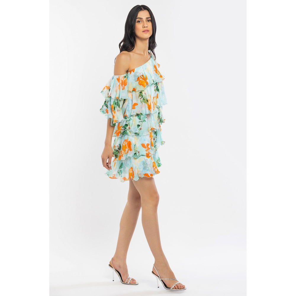 MANDIRA WIRK Chiffon Printed Tiered Short Dress Blue