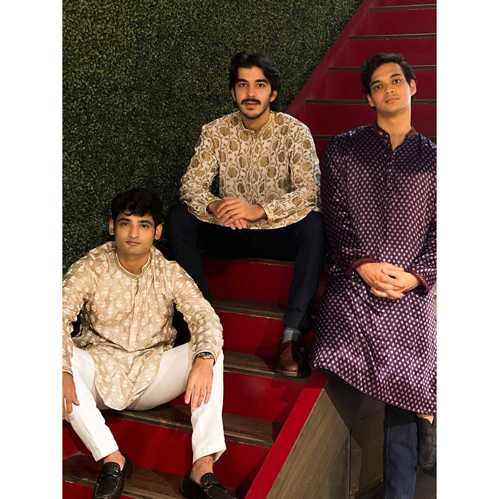 Description : This Benarasi kurta from Raishaa is an evergreen classic that radiates an authentic vibe. Crafted in rich quality georgette, this floral motif kurta features full sleeves, a mandarin collar and slant pockets. Team with a pair of contrasting bottoms to complete the look.