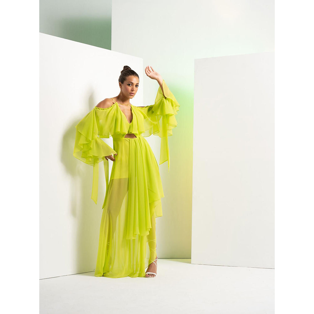 MANDIRA WIRK Lime Green Asymmetric Dress with Cascade Sleeve