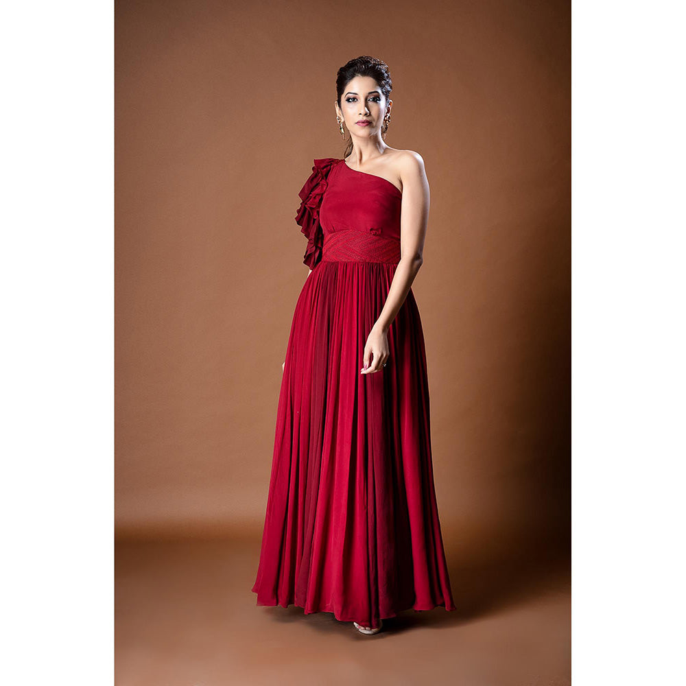 Description : A Red Colour Pure Crepe Gown Beautifully Adorned With Self Thread Embroidery. The Gown Is One Shoulder Featuring Ruffled Sleeves And Two Toned Panels.