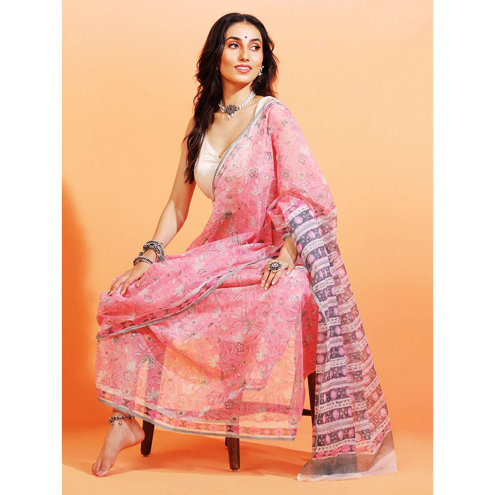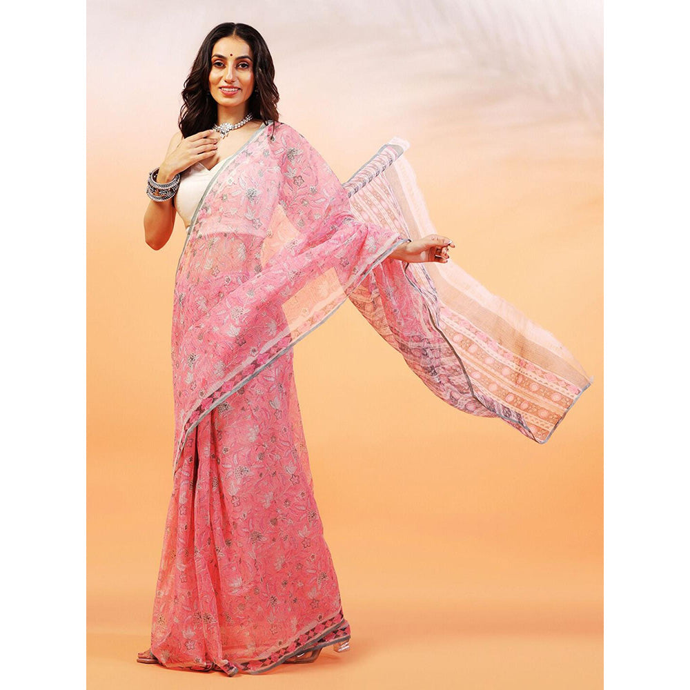Aditri Handloom Kota Doria Hand Block Print Pink Saree With Blouse Piece
