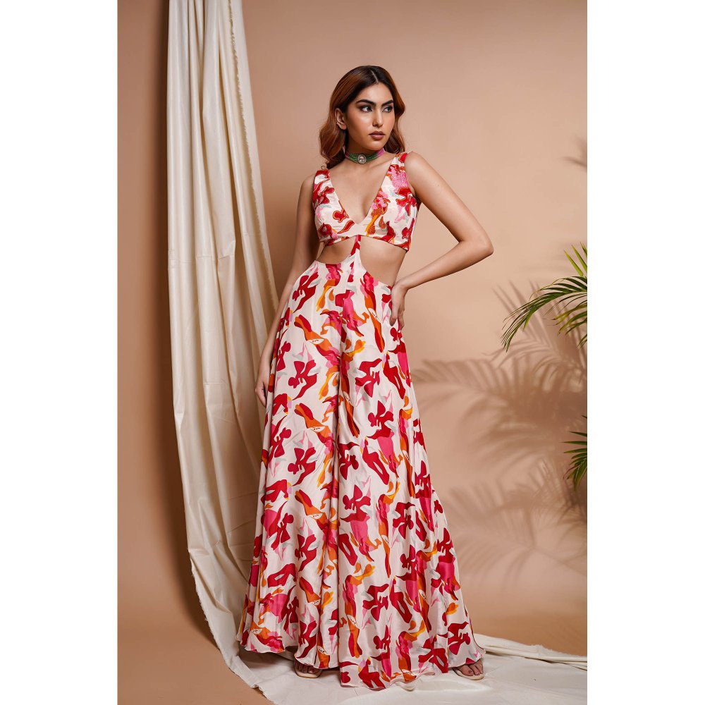 Cream Abstract Printed V-Neck Jumpsuit