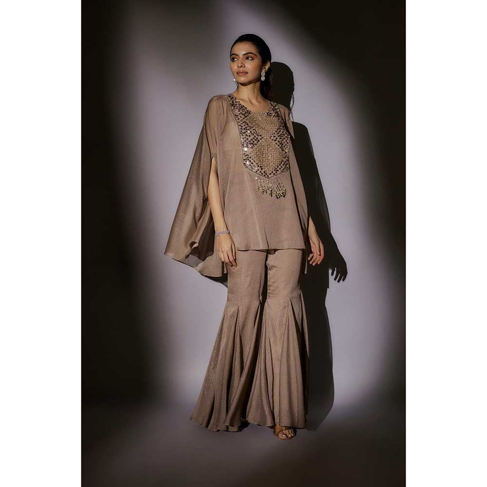 Beige Bella Sheer Cape with Bustier and Flared Sharara (Set of 3)