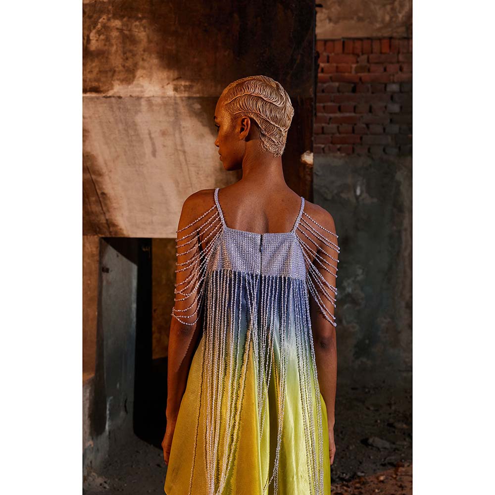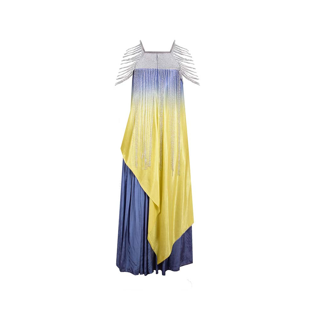 Description : Asymmetric Dress Layered with Gathered Chiffon, Hand-Embroidered Sequins Yoke, Straps & Tassels. Centre-Back Zipper Closure.