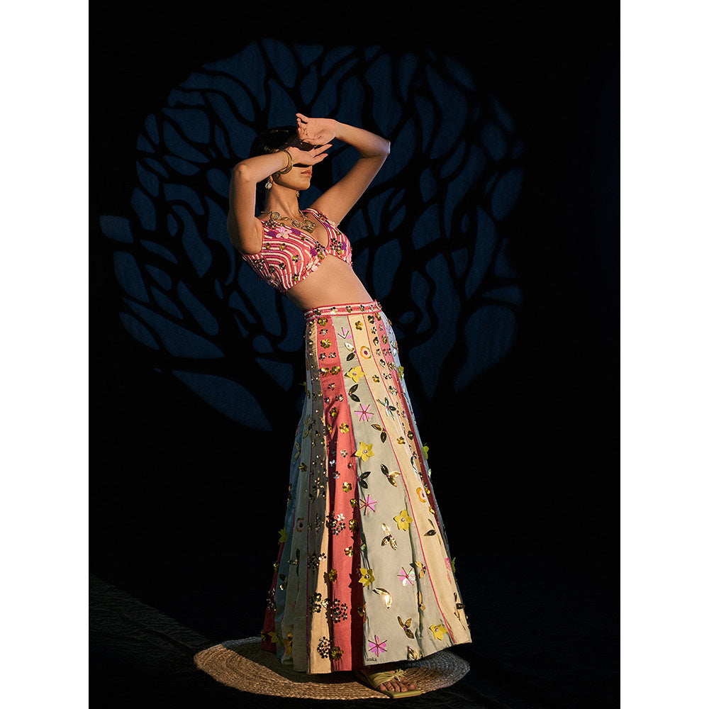 Description : Piyali Lehenga set can be worn by woman of dreams in a town of pastels, it has all those dreamy pastel pallete shades adorning blooming flowers and gold leaves. It comes along with hand embroided dupatta and an extraordinary rose pink blouse cut