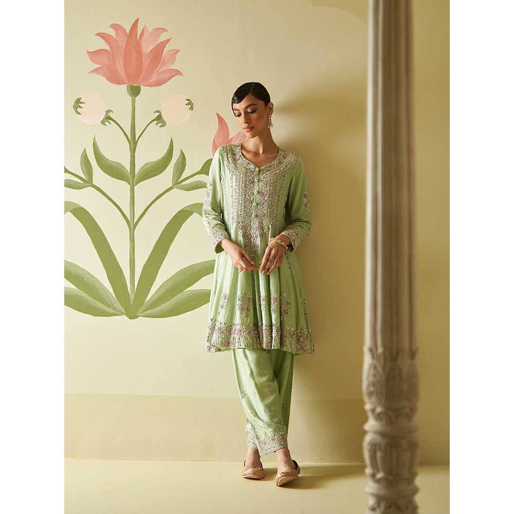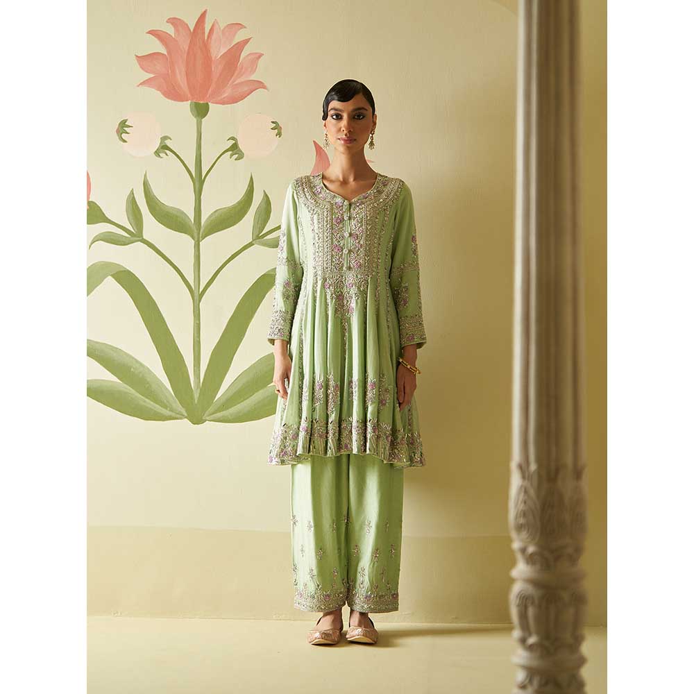 ANGAD SINGH Mint Green Chanderi Silk Anarkali Kurta with Pant & Dupatta (Set of 3)