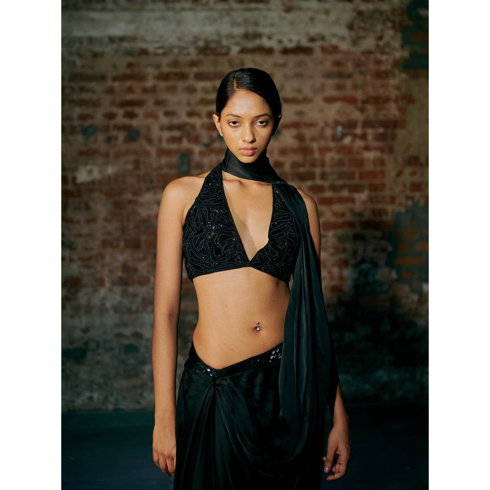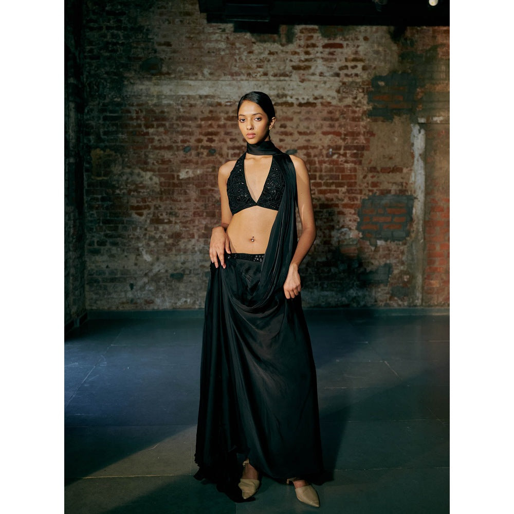 Chemy Green Satin Organza Drape Saree with Stitched Blouse