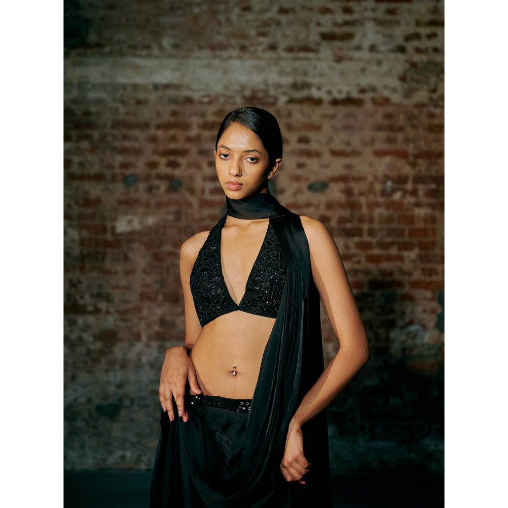 Asaga Chemy Green Satin Organza Drape Saree with Stitched Blouse