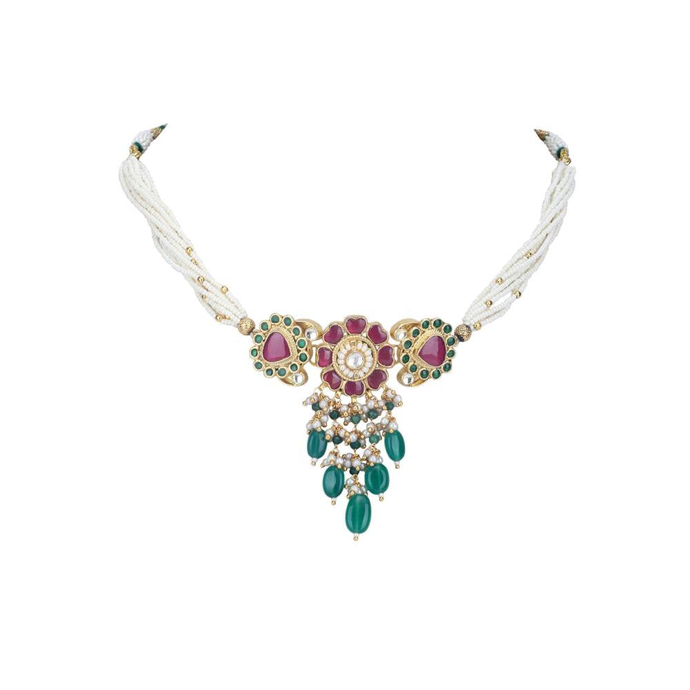 Auraa Trends 22Kt Gold Plated Kundan Red and Green Choker Necklace Set for Women and Girls
