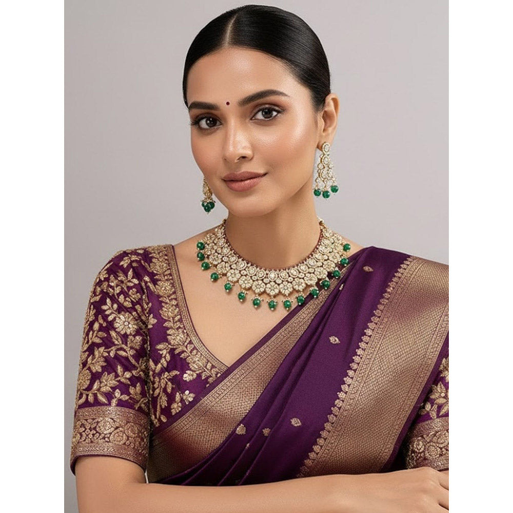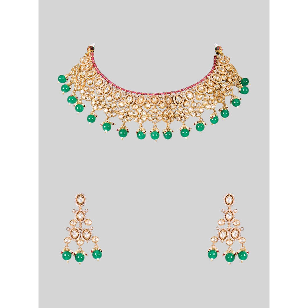 Auraa Trends Traditional Gold-Plated Green Beads Kundan Choker Jewellery Set