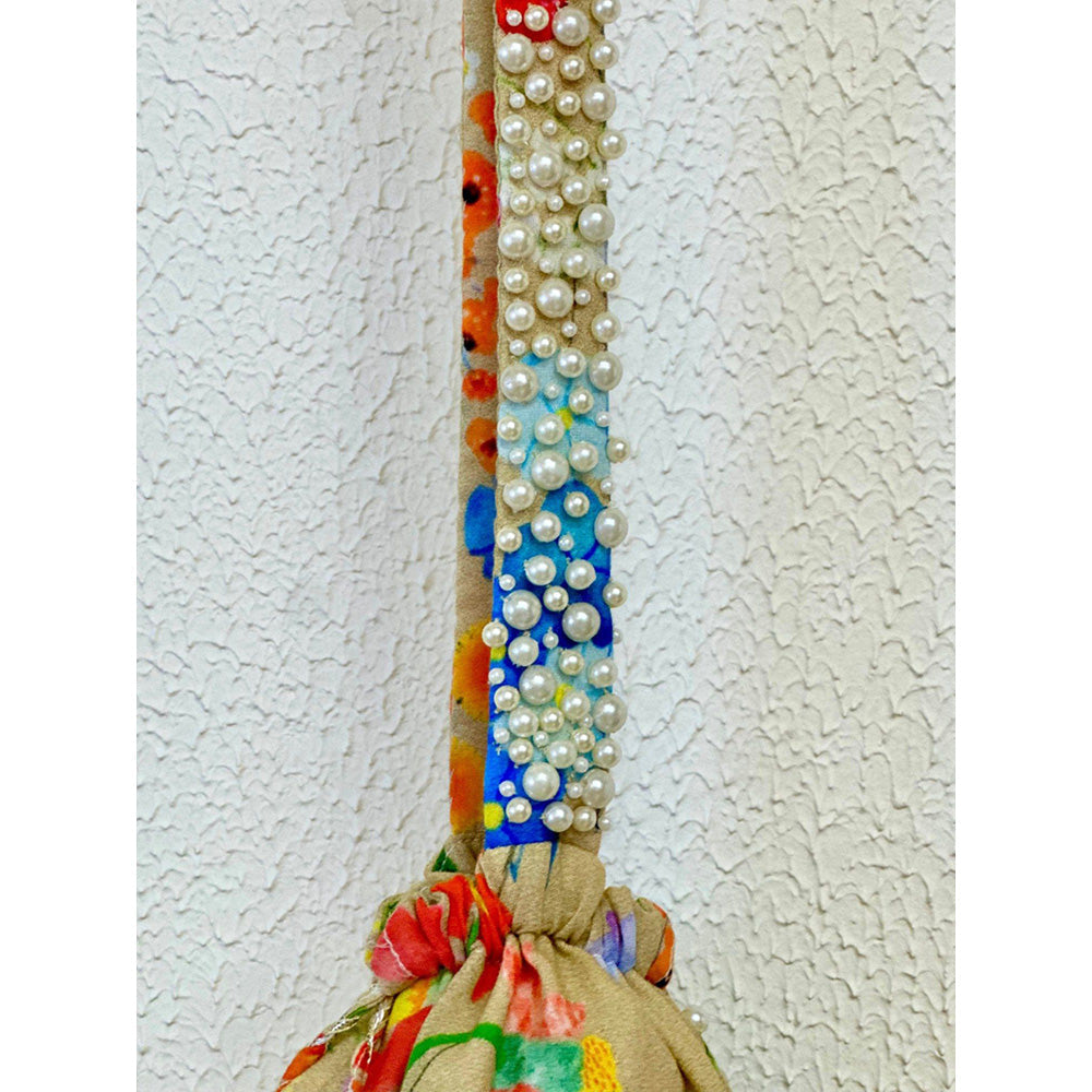 Description : "Beige floral printed potli with Pearl Embellished/Sequined all over - The potli belt has thick hand Embellished/Sequined done by 2-3 sizes of pearls - Beautiful handmade tassels attached on the drawstring ". It is sure to fetch you from all. Join the league of fashion elites flaunting the staple.
