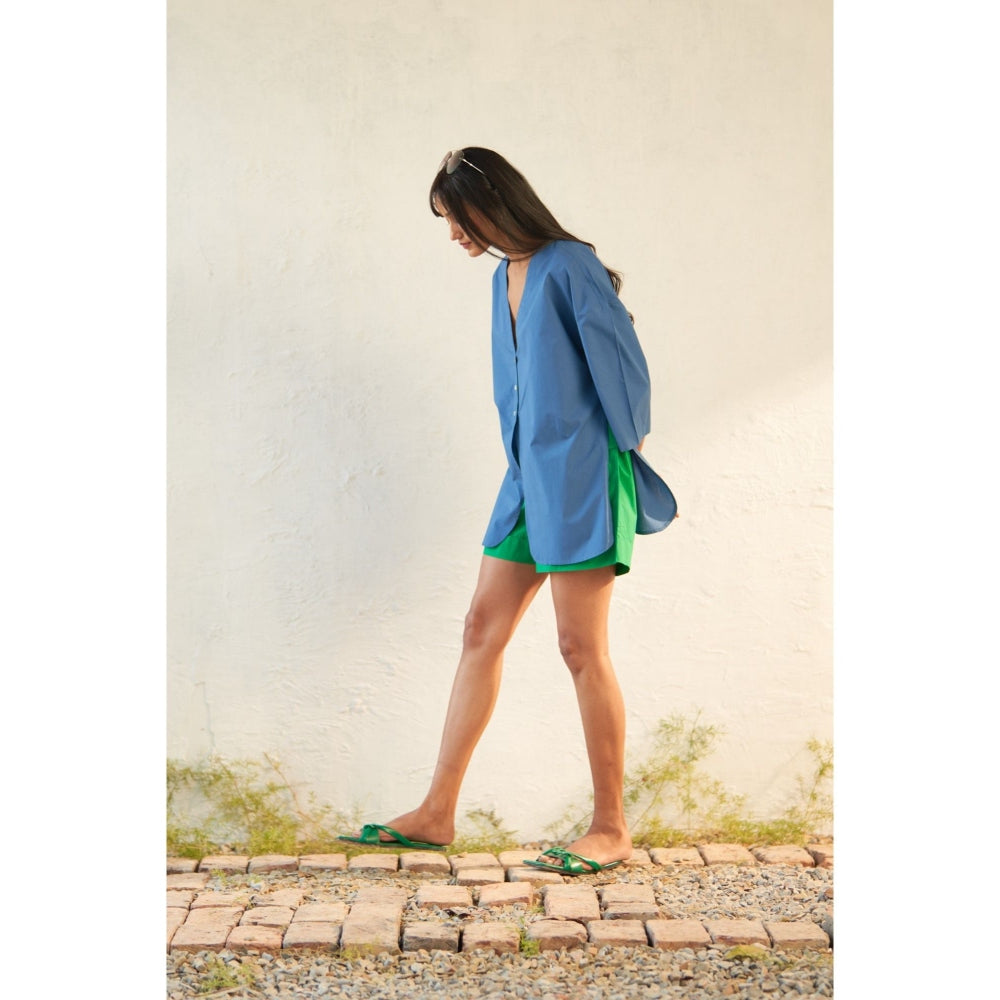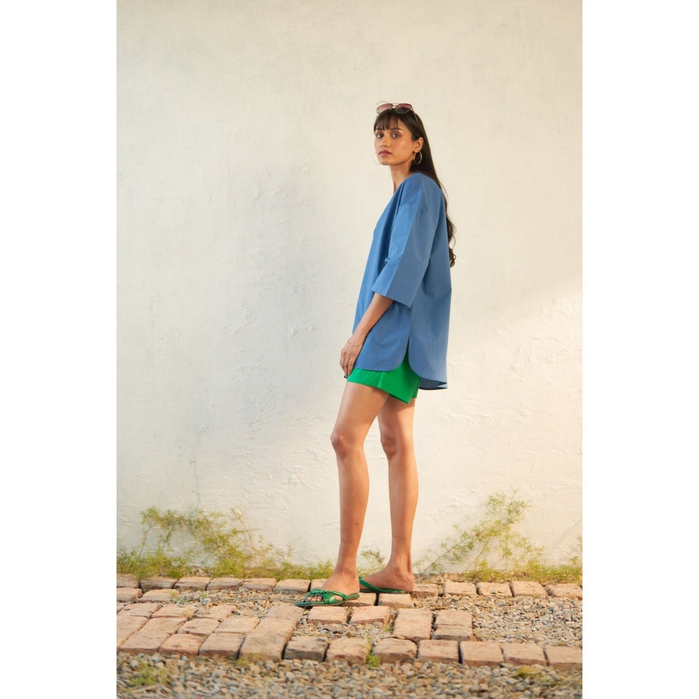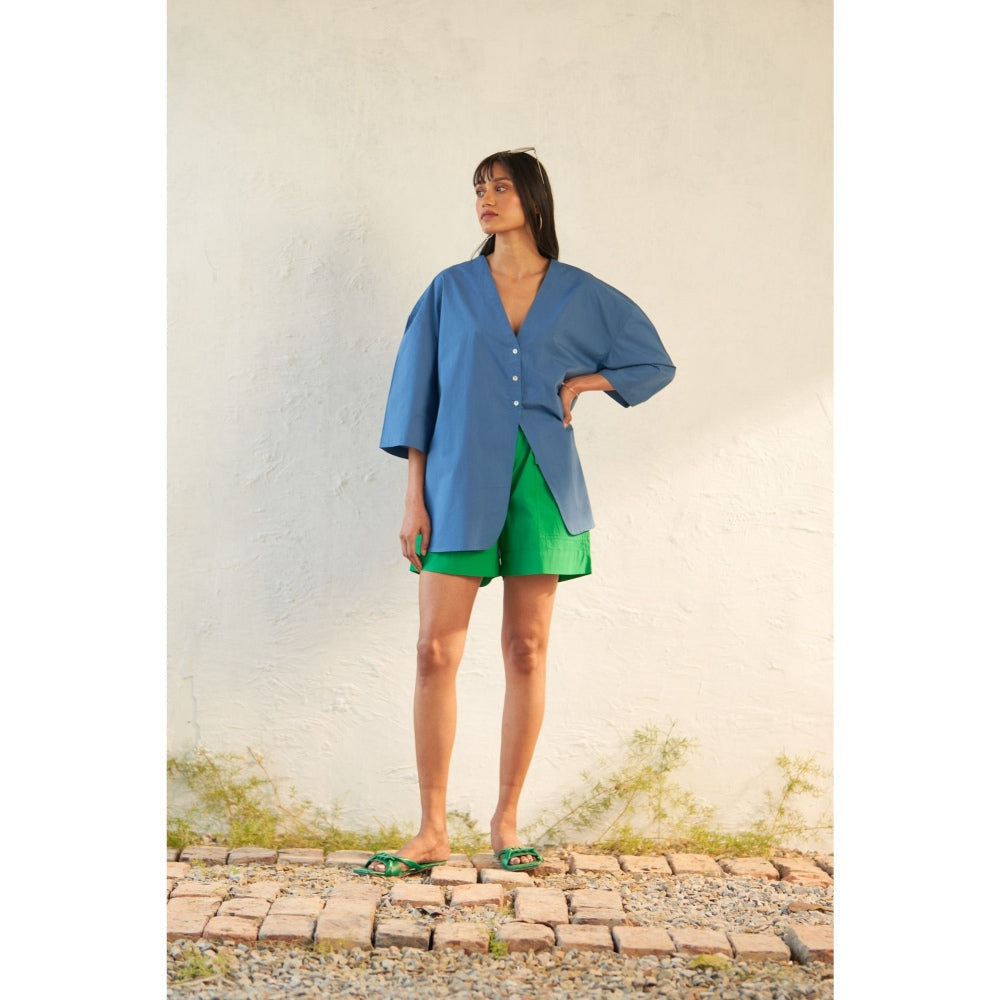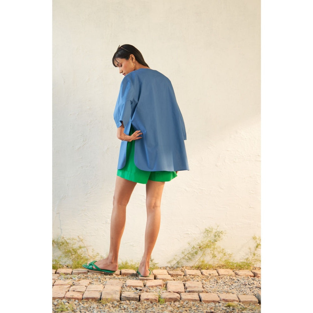 Description : This Ensemble Is Meticulously Crafted From Premium Cotton Poplin Fabric. Embracing A Fresh Interpretation Of The Classic Tailored Shirt, It Features A Collar Plunging Neckline Seamlessly Integrated Into A Short Placket and Free-Flowing Panels, Resulting In A Modern Oversized Shape. Paired with Shorts Adorned with A Half Elastic Waistband and Flap Pockets, This Outfit Exudes Both Style and Functionality.