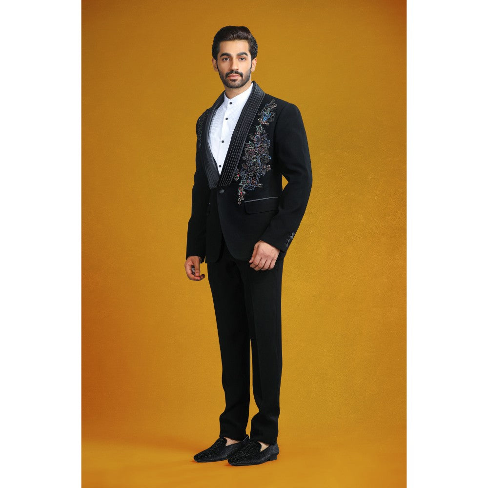 Description : Obsidian Opulence tuxedo made from high-quality Japanese fabric with intricate beadwork and hand-embroidered designs, offering comfort with a pop of color.