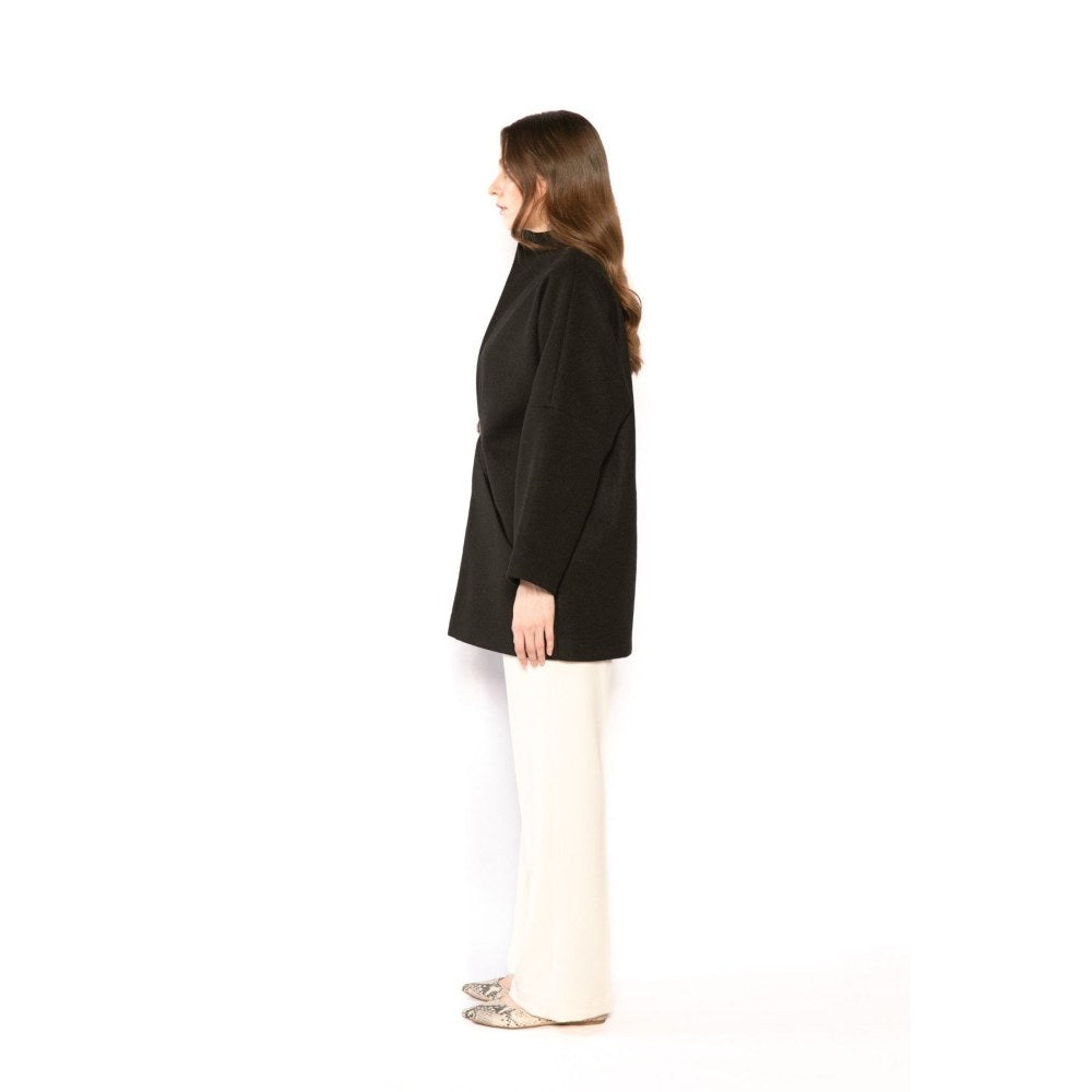 Description : A Bell-Sleeved Coat With A Crew Neck And A Center Buckle Closure At The Waist. Features A Boxy Fit And Includes Two Paneled Pockets In The Front, Offering A Structured, Voluminous Silhouette.