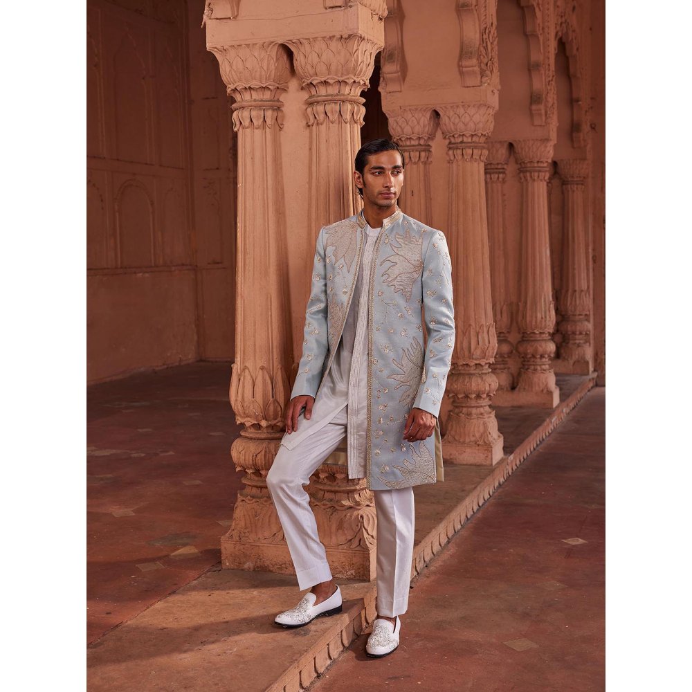 CONTRAST BY PARTH Blue Elaya Open Sherwani with Kurta and Pant (Set of 3)