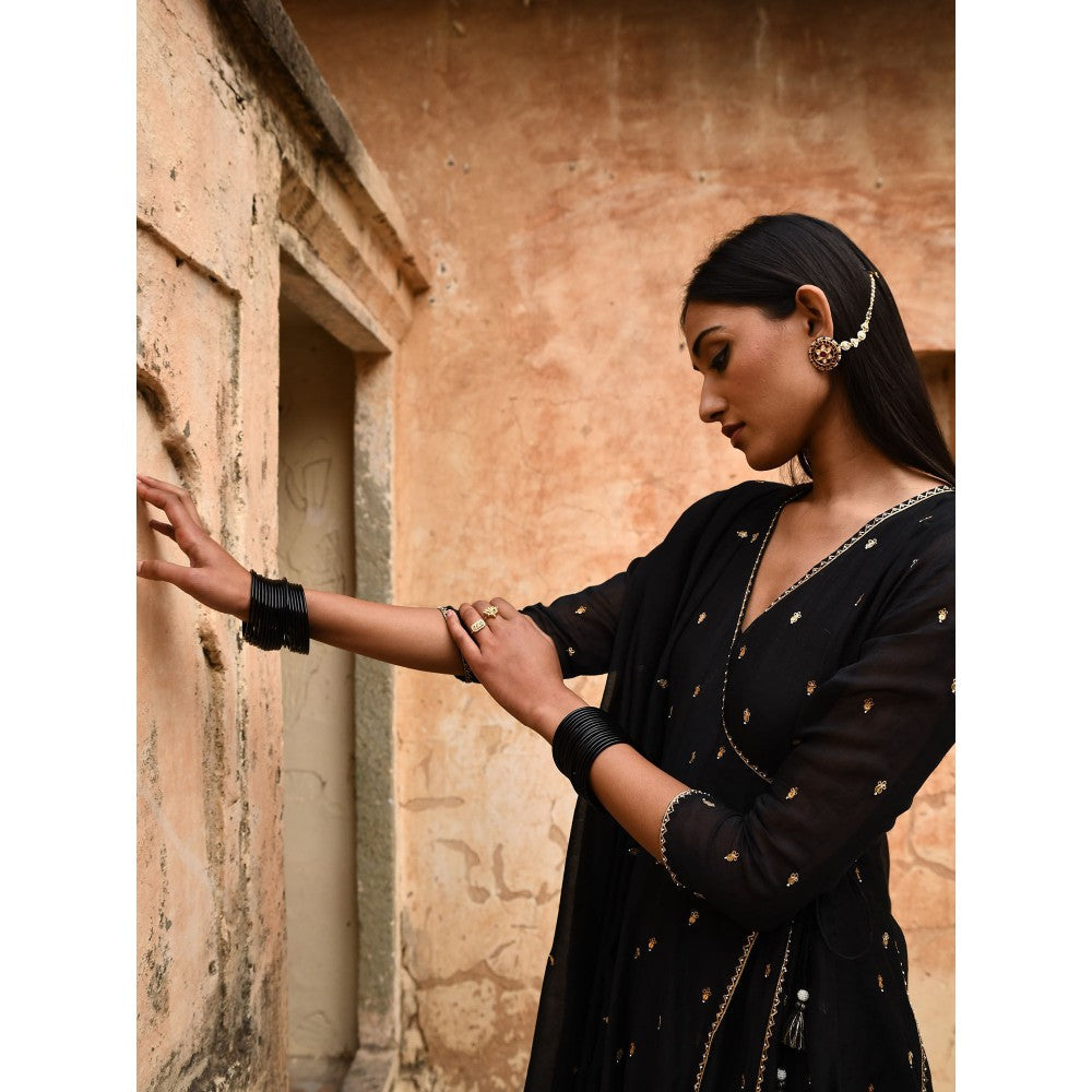 Description : Black Sequnce And Zari Booti Embroidered On Kalli Angrakha, The Kallis Are Highlighted With Kalyani Booti. This Angrakha Is Paired With Straight Pants And Sequence Booti Embroidered Dupatta