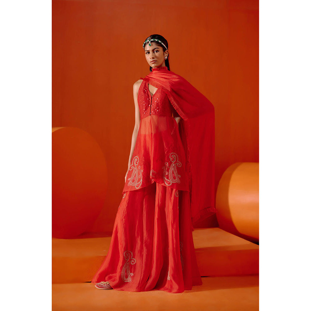Description : The red sharara set features multi-hued Dori embroidery over the beautiful kalidar organza short kurta. The outfit is paired with a matching high waisted embroidered sharara and a subtle silk dupatta.