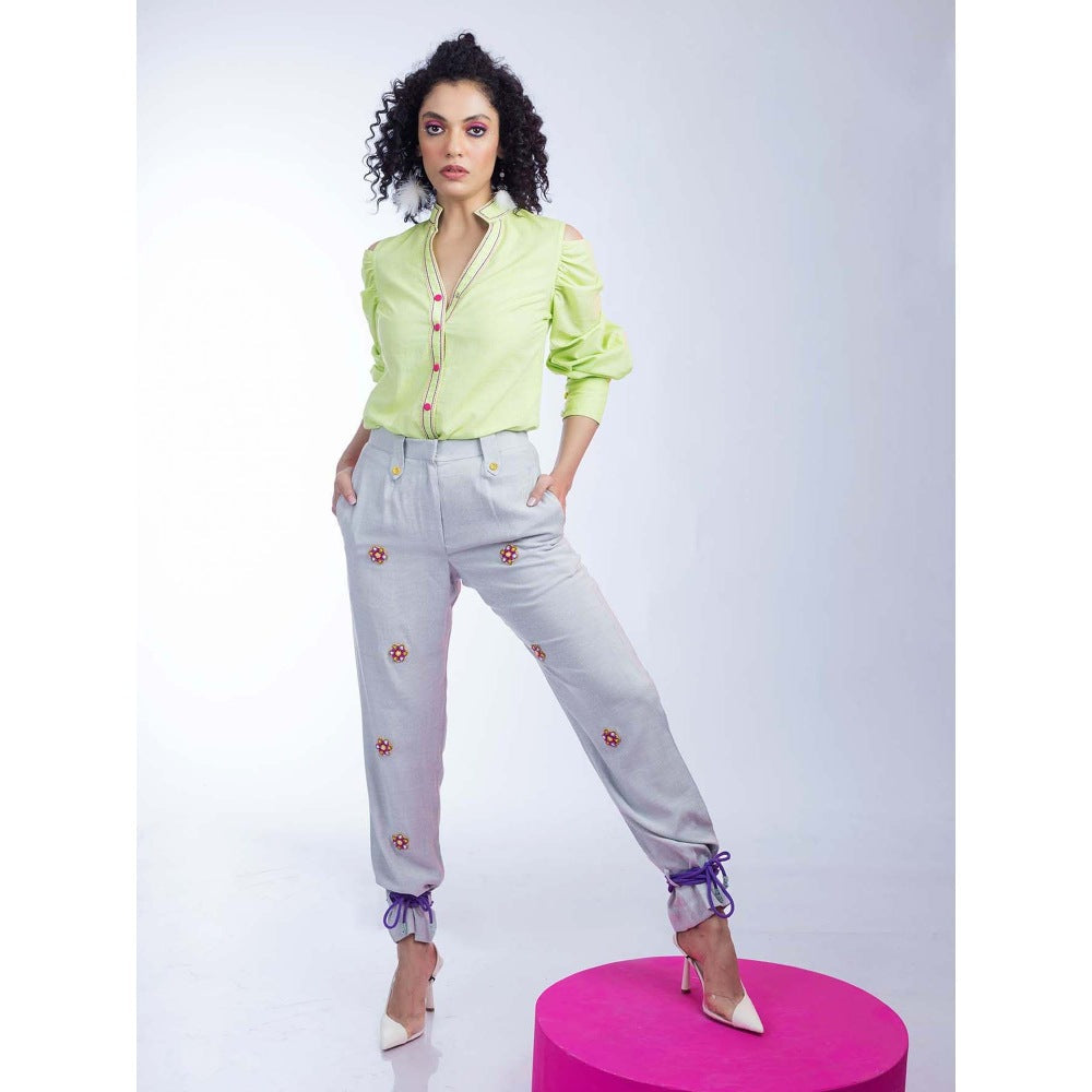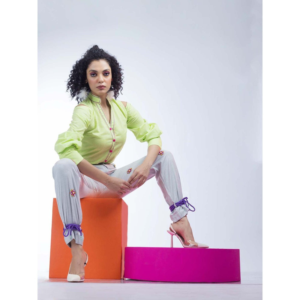 Description : Neon Green Paired With Textured Ivory Pant In Cotton Features Exquisite Bead Embroidery And Fabric Button Detailing, Pant Highlighted With Purple Rope Tie-Up Details. The Cold Shoulder Design Adds A Playful Look To The Ensemble.