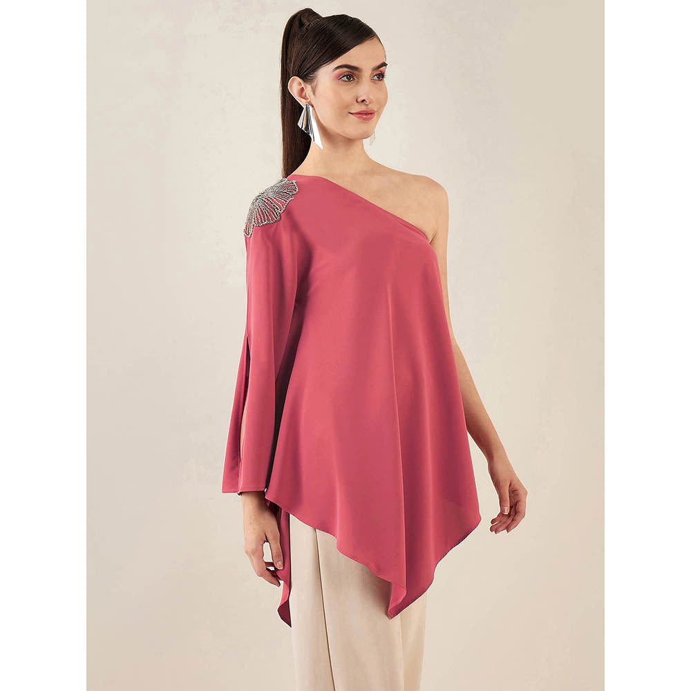 First Resort by Ramola Bachchan Rouge Red One-Shoulder Crystal Embroidered Top