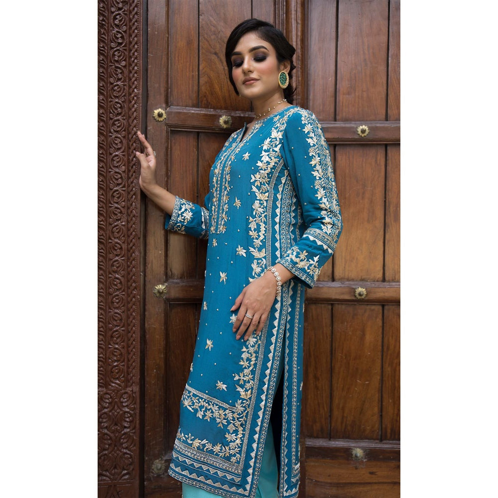 Description : Stay pretty in an effortless manner with this teal palazzo set from House Of Muher. Tailored from crepe with a comfortable fit, it features a round neck and three fourth sleeves. Tag this set with a pair of mules for a complete look.