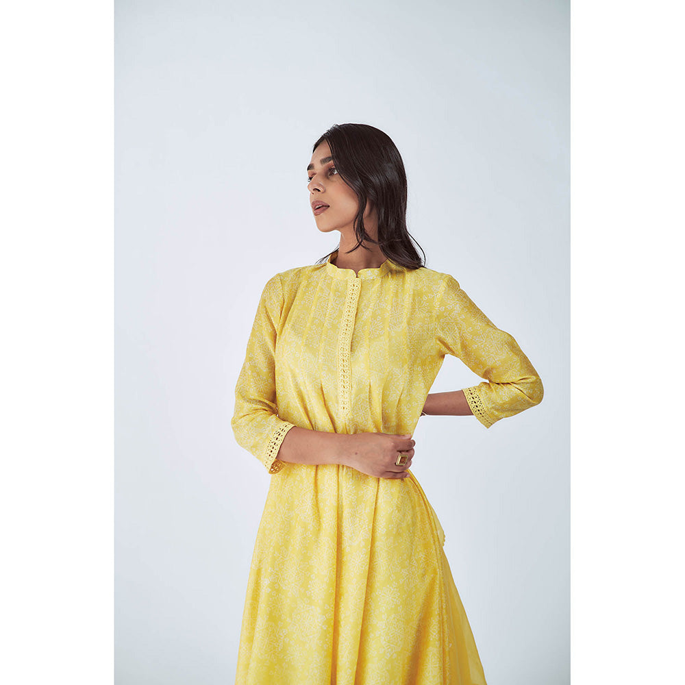 House of Pink Yellow Chanderi Printed & Embroidered Kurta Pant & Scarf (Set of 3)