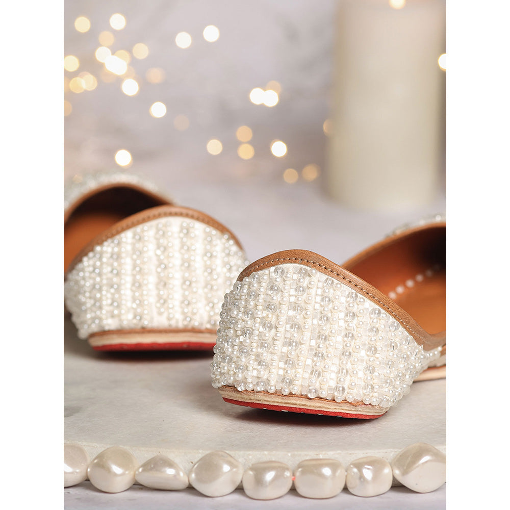 Description : Step into style with Nooriya Juttis - elegant white juttis adorned with 10 different white stones and beads. Perfect for any occasion, these embellished shoes add a touch of glamour to your look. Be the envy of everyone with these stunning juttis!