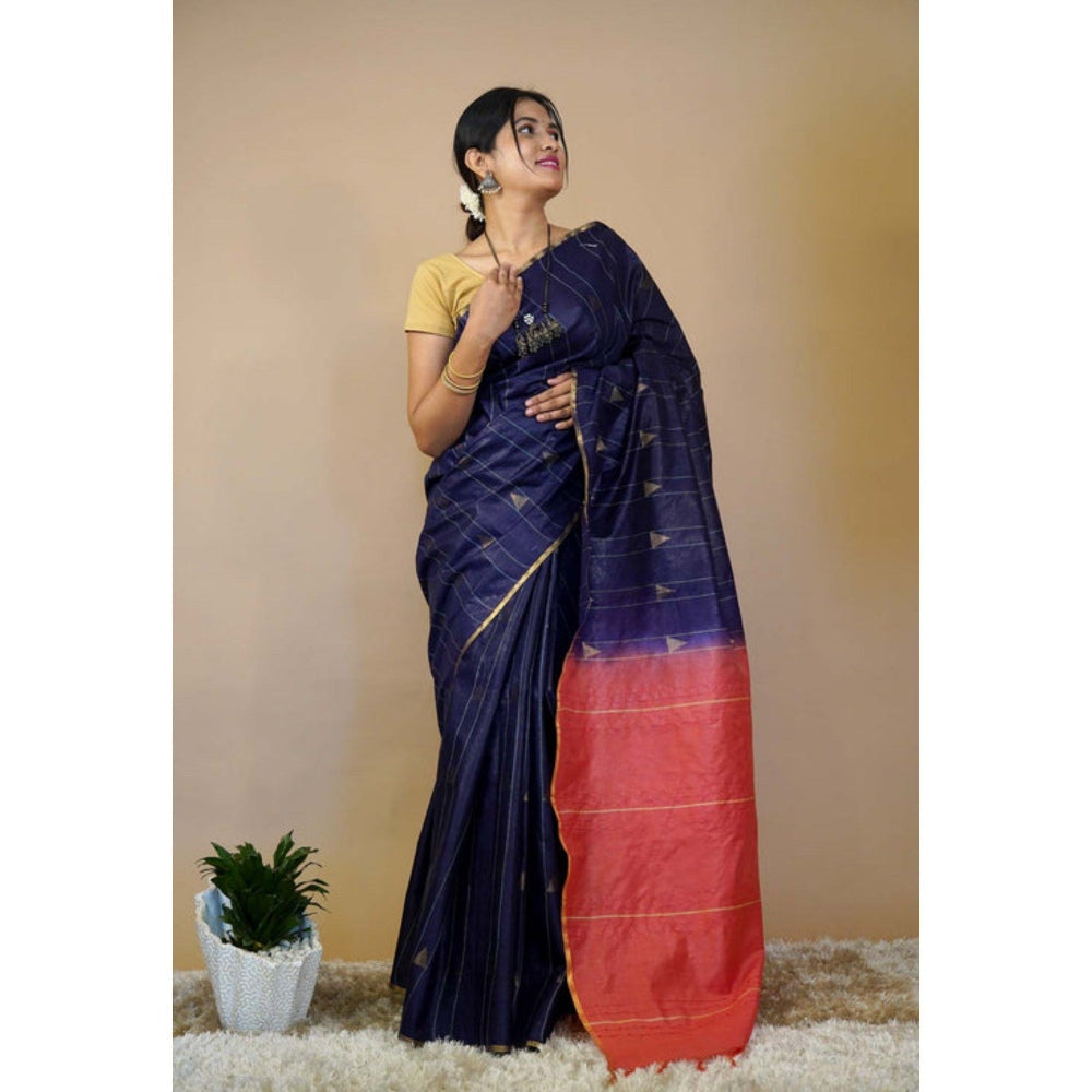 Womens Stripes Tassels Navy Blue Pre-Draped Saree with Unstitched Blouse