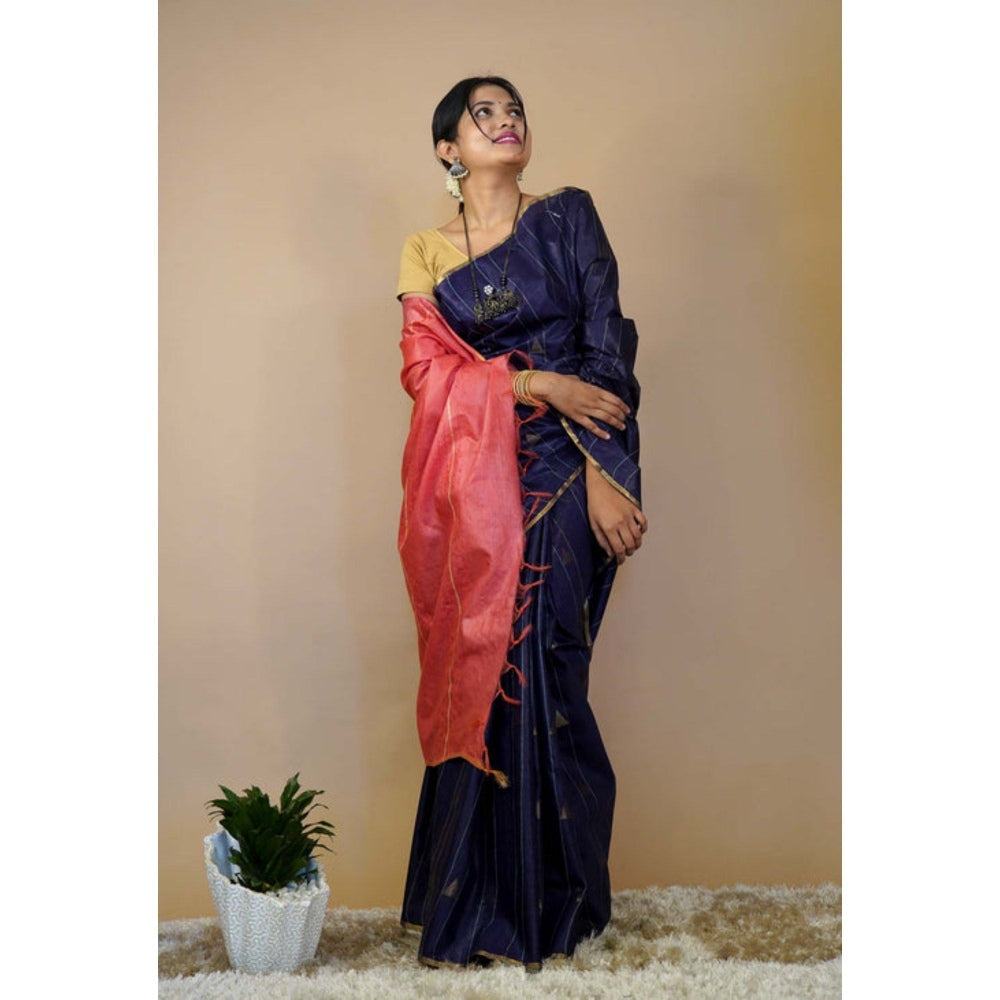 Isadora Life Womens Stripes Tassels Navy Blue Pre-Draped Saree with Unstitched Blouse