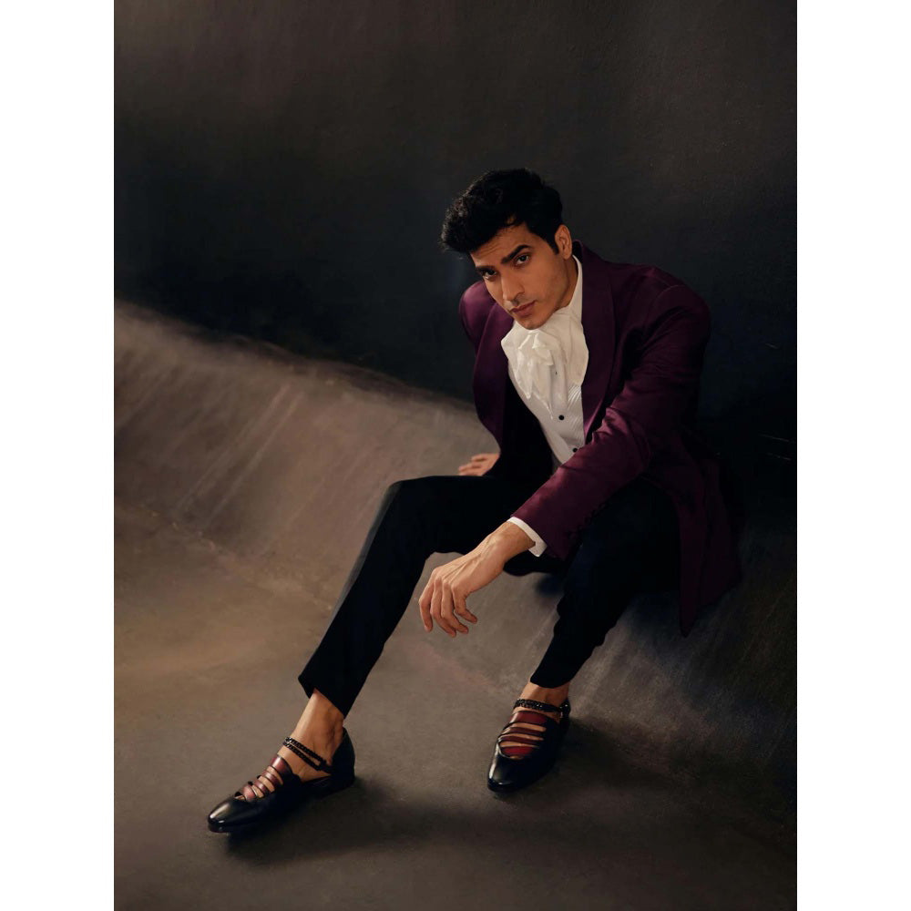 Description : Featuring classic wine tuxedo in linen silk. paired with white pintuck shirt and tapered trousers.