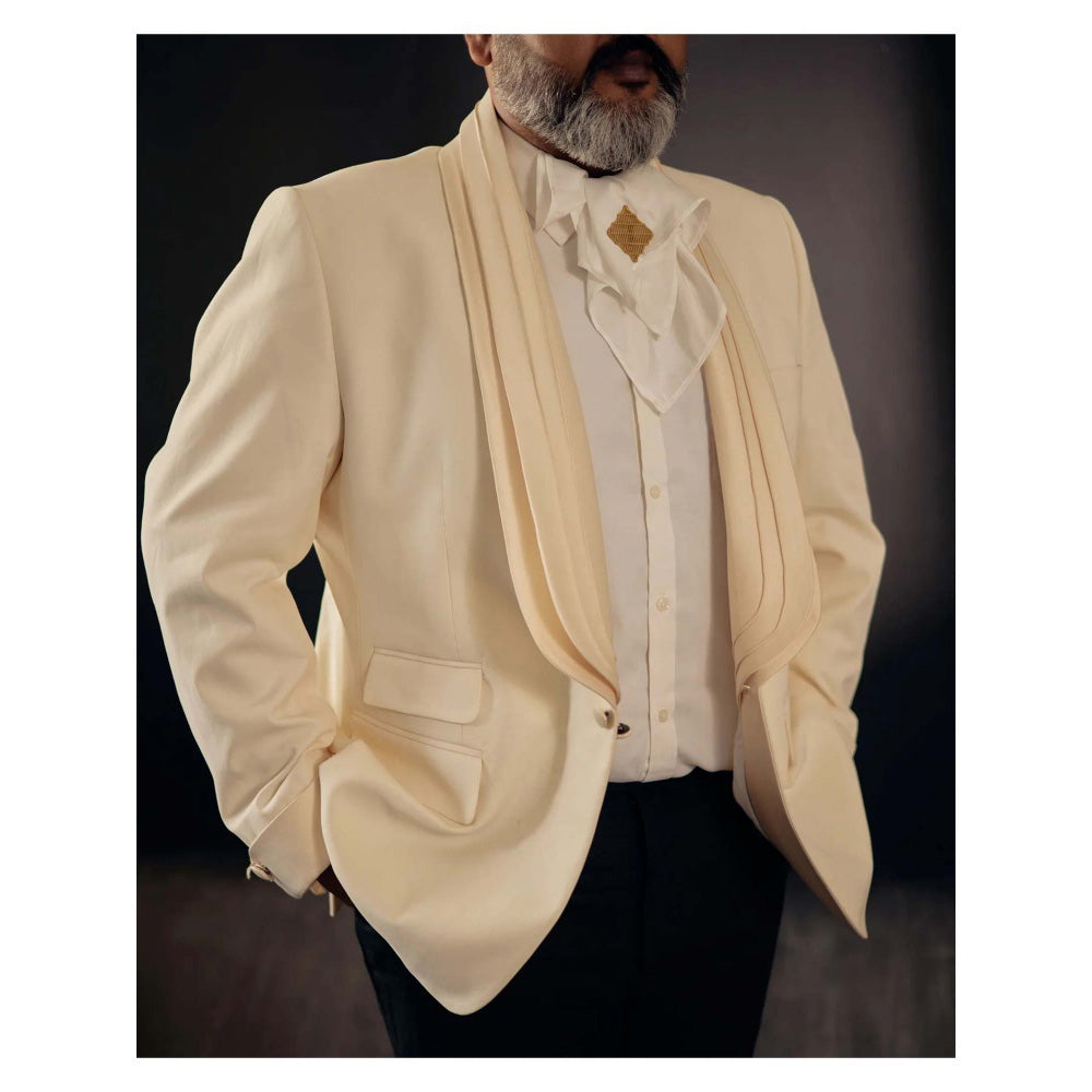Description : Featuring classic cream tuxedo with double lapel collar. paired with white shirt and black tapered trousers.