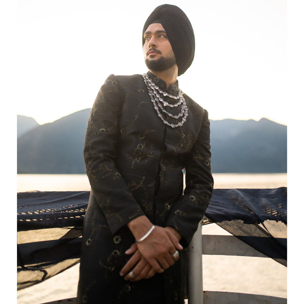 Description : Presenting The Iris Achkan From Our New Collection Monet, with Hints Of Gold Over A Black Ensemble, Perfect All Your Upcoming Night Functions! Paired with Tapered Trousers.