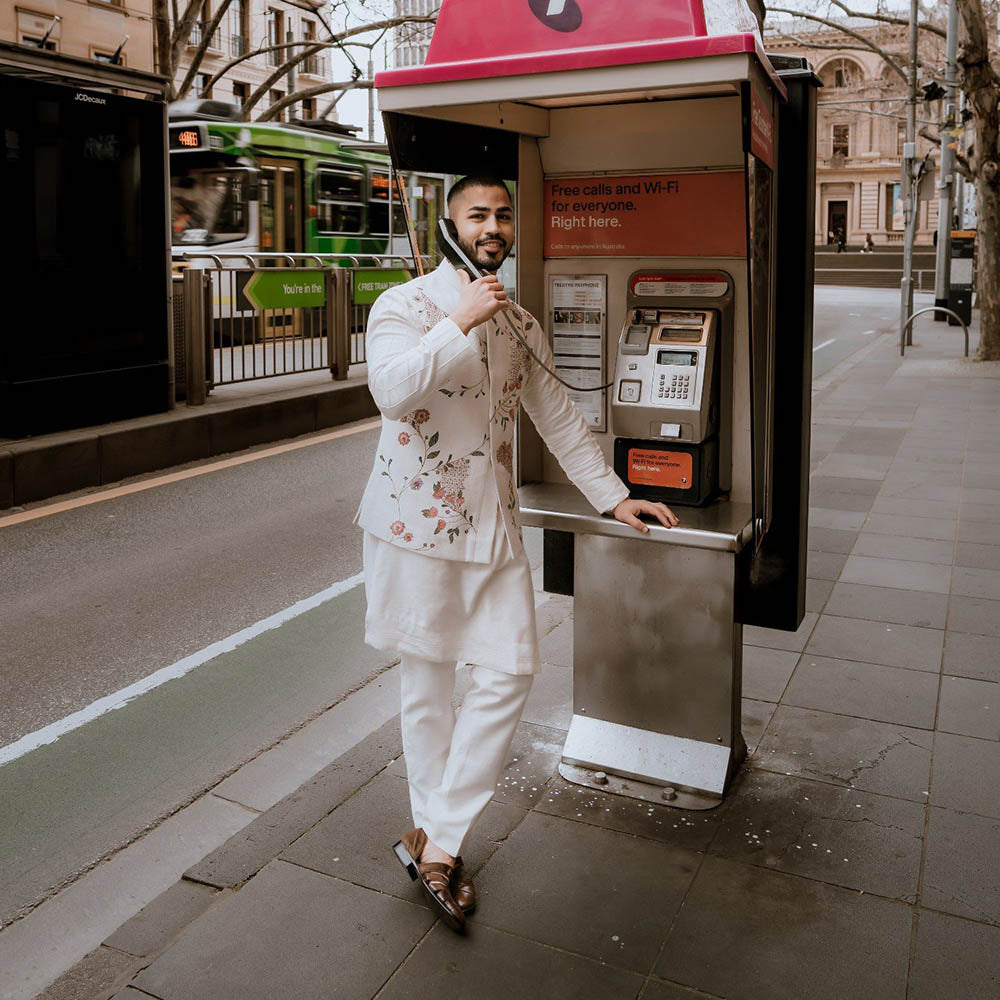 Description : Presenting Porcelain Petals Nehru Jacket Set On A Slub Silk Hand-Textured Base with Intricate Hand Paint Floral Details and 3-D Gold Elements. Paired with A Tone-On-Tone Kurta and Tapered Trousers.