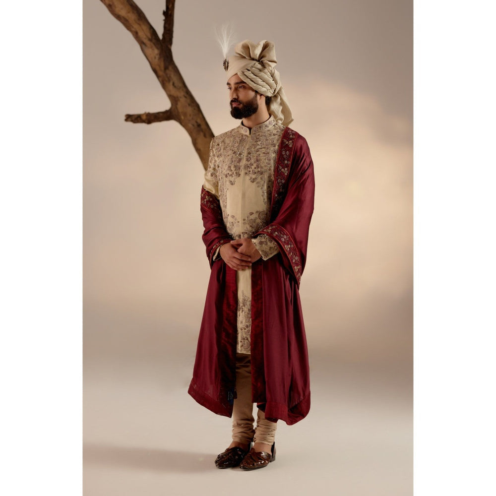 Description : Featuring our work of art in our sand grey sherwani which is intricately hand-embroidered with resham, silver threads, dabka and zari.Paired with a wine hand-embroidered stole and a matching safa.