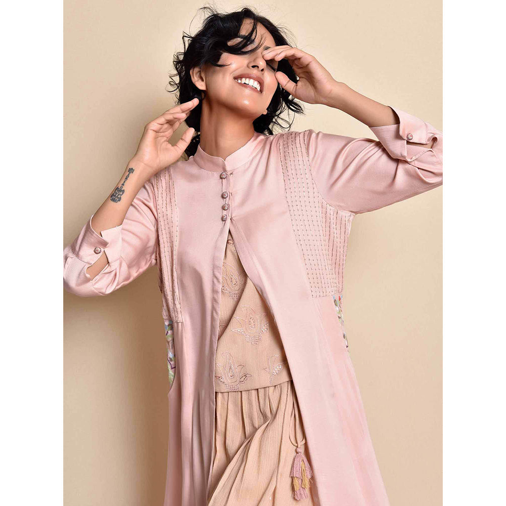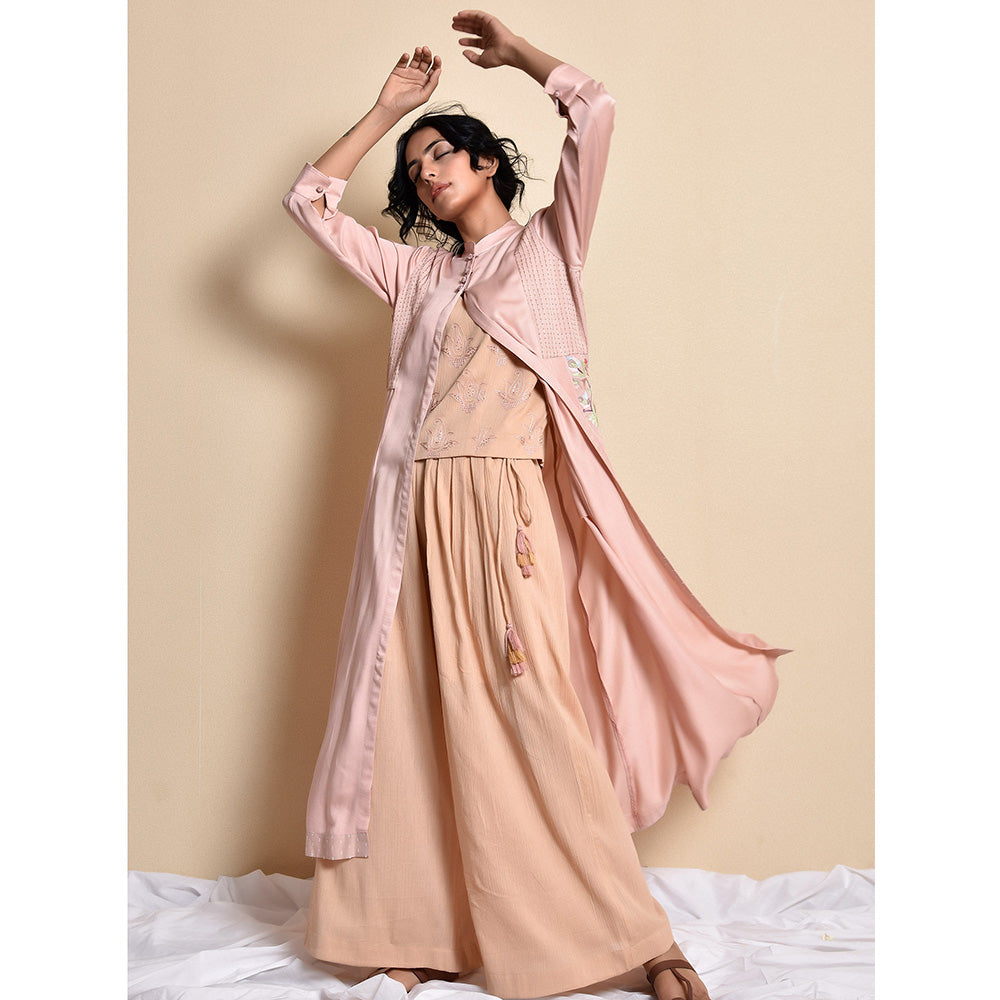 Description : This set by Kanika Sharma features a peach camisole and jama bottom crafted in cotton and a dull modal jacket. The jacket features kashmiri hand embroidery over the torso and pockets with button closures on the collar and at the border of the 3/4th sleeves. The inner top features a crincled texture and the bottom is embellished with handcrafted tassels. Style this set with gold contemporary jewelry for an elegant evening look.