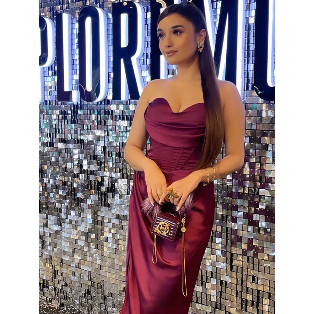 Description : Draped Strapless/Tube Neck Midi Dress with A Thigh High Slit and Corset Waist. Padded and Back Zip