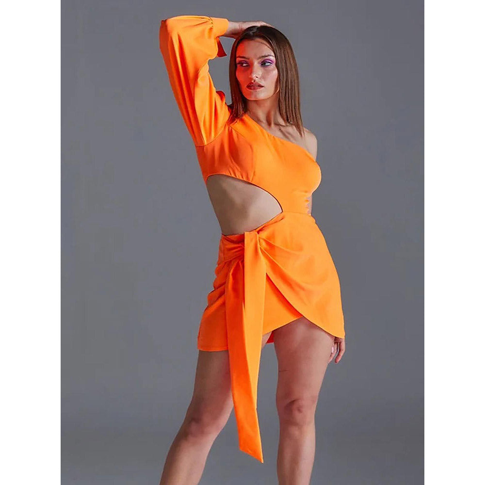 Description : Vitamins Orange Mini Dress Has One Shoulder Slim Fit Which Is Good For The Party