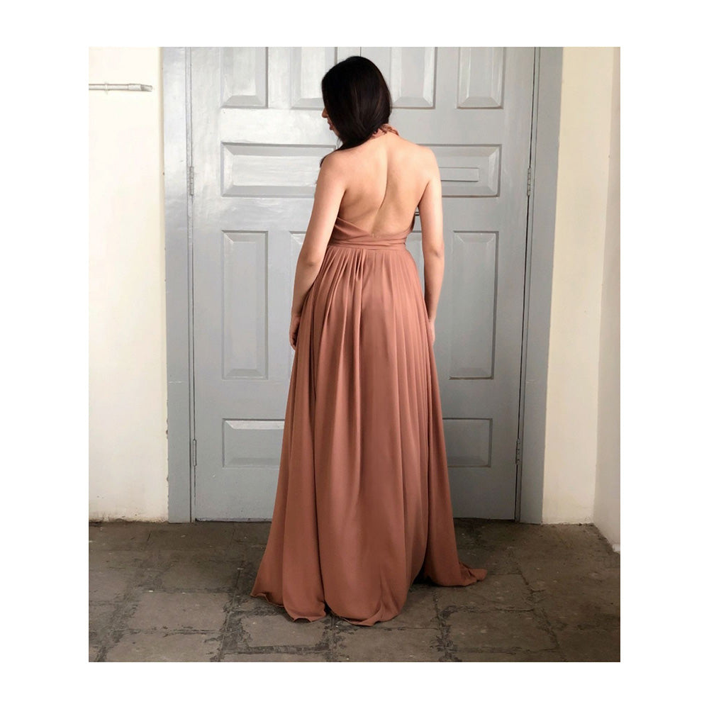Description : Plunge Neck Halter Back Pleated Gown
