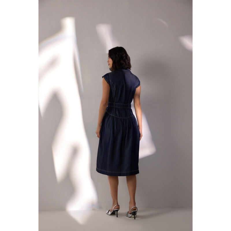 Description : Dress : Midi Dress In A Relaxed Fit Short Cap Sleeve Stop-Stitch Details All Over Lapel Collar Side Opening With Concealed Zipper Silver Metal Buttons & Fastenings Fabric : Butter Soft Denim-Effect Fabric Wash Care Instructions: Dry Clean Only Model's Height: 5'8'
