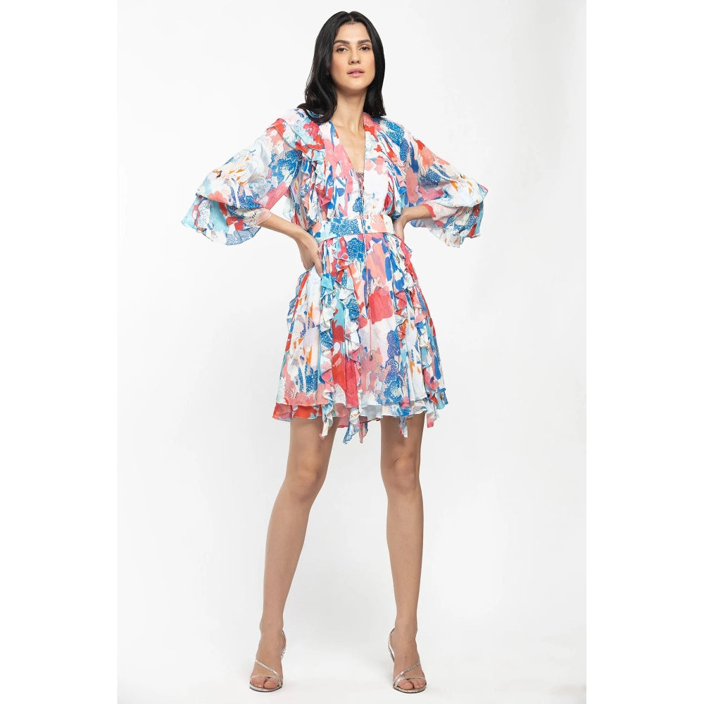 MANDIRA WIRK Chiffon Printed Short Frilled Dress with Belt Pink & Blue (Set of 2)