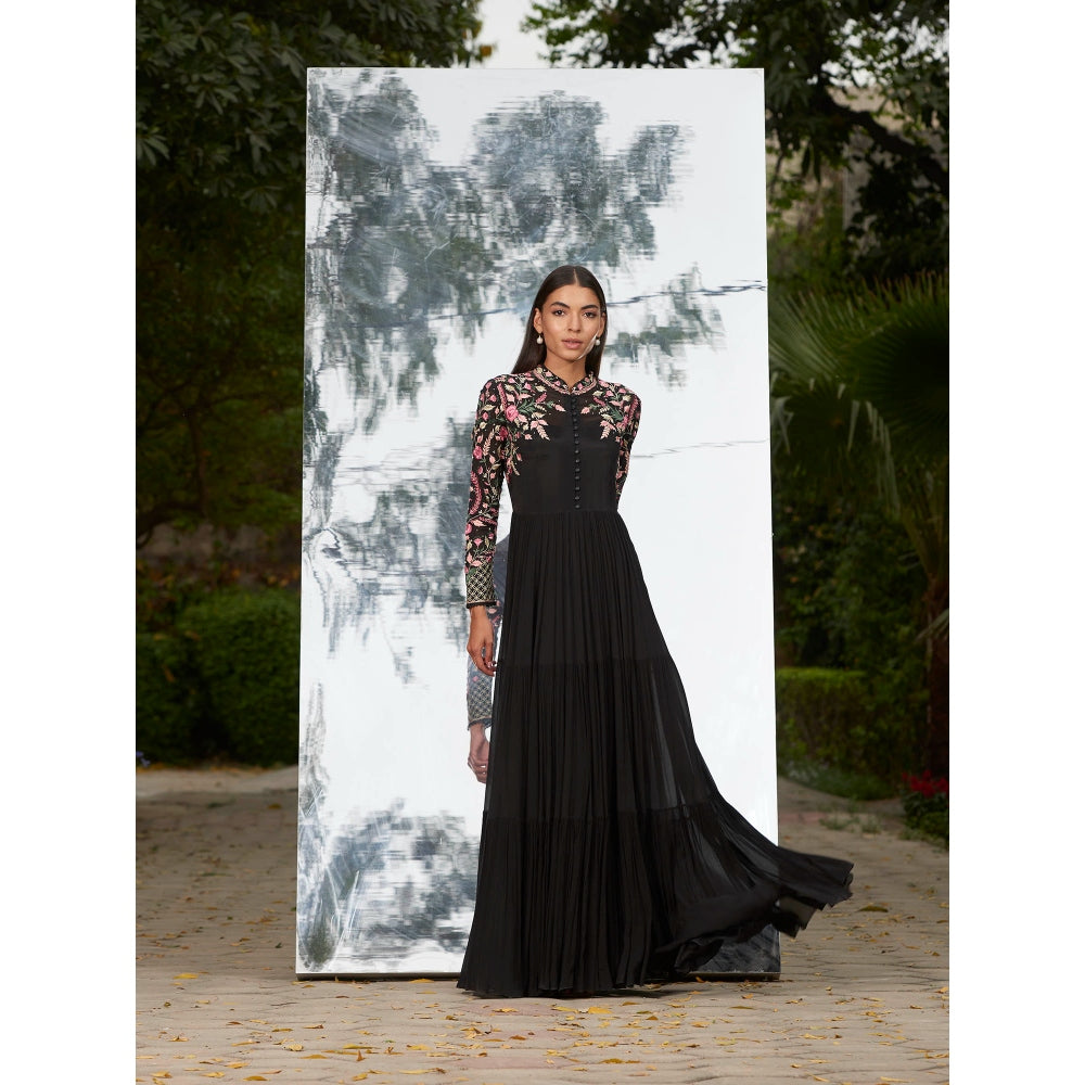 Description : Slay your weekend brunches with this black, embroidered, tiered dress from Mandira Wirk. It has multicolour thread with sequins and beaded embroidery, along with a band collar. Pair it with heels and a clutch to complete the look.