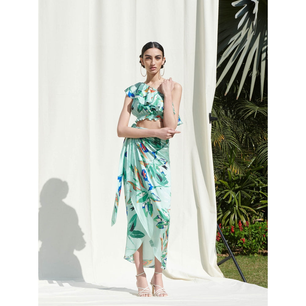 Description : Elevate your casual collection with this set from Mandira Wink. Crafted in crepe satin, this green printed one shoulder frill crop top paired with a printed wrap around skirt is what you need. Style it with heels and minimal jewelry to complete the look.